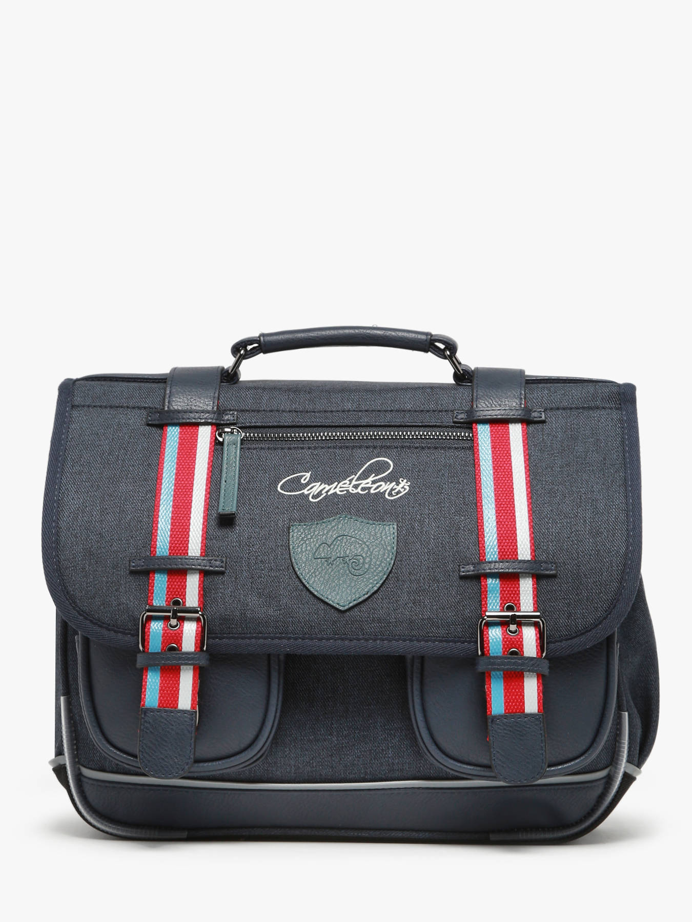 35 cm - 12 liter - 1 kg ~ Deze schooltas uit de Vintage collectie van het merk Caméléon heeft een breedte van 35 cm. Ideaal voor die eerste ontdekkingstocht naar de basisschool! Dit model heeft een duidelijke vintage look, dankzij de twee voorvakjes en de riempjes met gesp. Dit model beschikt over twee compartimenten, die schriftjes (24x32 cm) en andere kleine spulletjes kunnen bevatten. Onder de overslagflap bevindt zich ook een uniek opbergvak, met daarin een gratis liniaal! De twee vakjes met rits vooraan zijn ideaal om een snack of zakdoek in op te bergen. Dit model beschikt ook over een naamlabel, en kan makkelijk gesloten worden dankzij een dubbel kliksysteem. Voor optimaal comfort zijn de rugzijde en schouderbandjes extra gewatteerd. Dankzij enkele reflectoren kan uw kind zich ook veilig in het verkeer begeven. Vintage op z'n mooist!